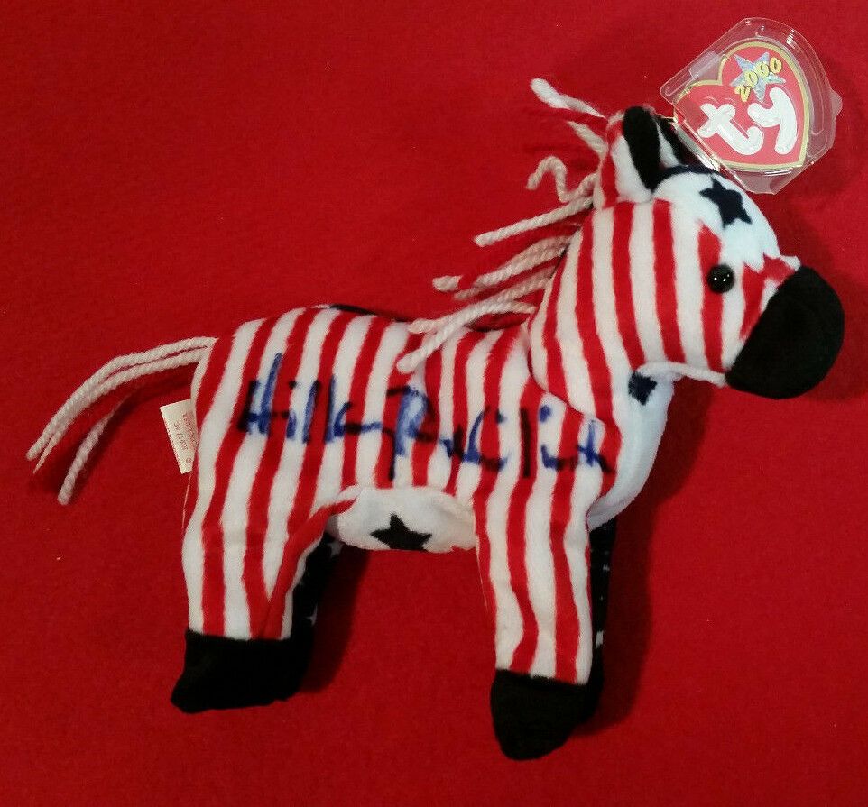 Political beanies Lefty the Donkey and Righty the Elephant were originally released in 1996, with new designs produced in 2000, 2003, and 2008. None of these toys were particularly valuable until two Lefty donkeys from 2000 were signed by former First Lady of the United States – and the 2016 Democratic candidate for President – Hillary Rodham Clinton. An avionics technician met Clinton in 2006 and asked her to sign the two beanies for his young daughters. Both donkeys are now listed on eBay for $10,000.
