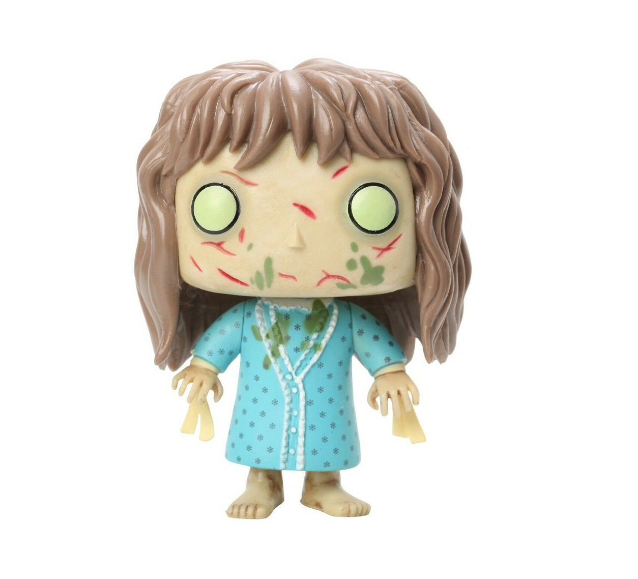The Exorcist is still considered by many to be one of the scariest horror films ever made. It is by far one of the most profitable. At the center of the story is Regan, a 12 year old girl who has been possessed by the demon Pazuzu. While under its control, Regan curses incessantly, levitates above the bed, masturbates with a cross, spider-walks around the house, kills a man and spews pea soup all over the two priests trying to save her. Regan is definitely having one hell of a day. The Funko figure features the possessed eyes and cuts all over her skin. On her wrists are the broken straps that she was tied to the bed with and her face and nightgown are dribbling with the remnants of her pea soup vomit.