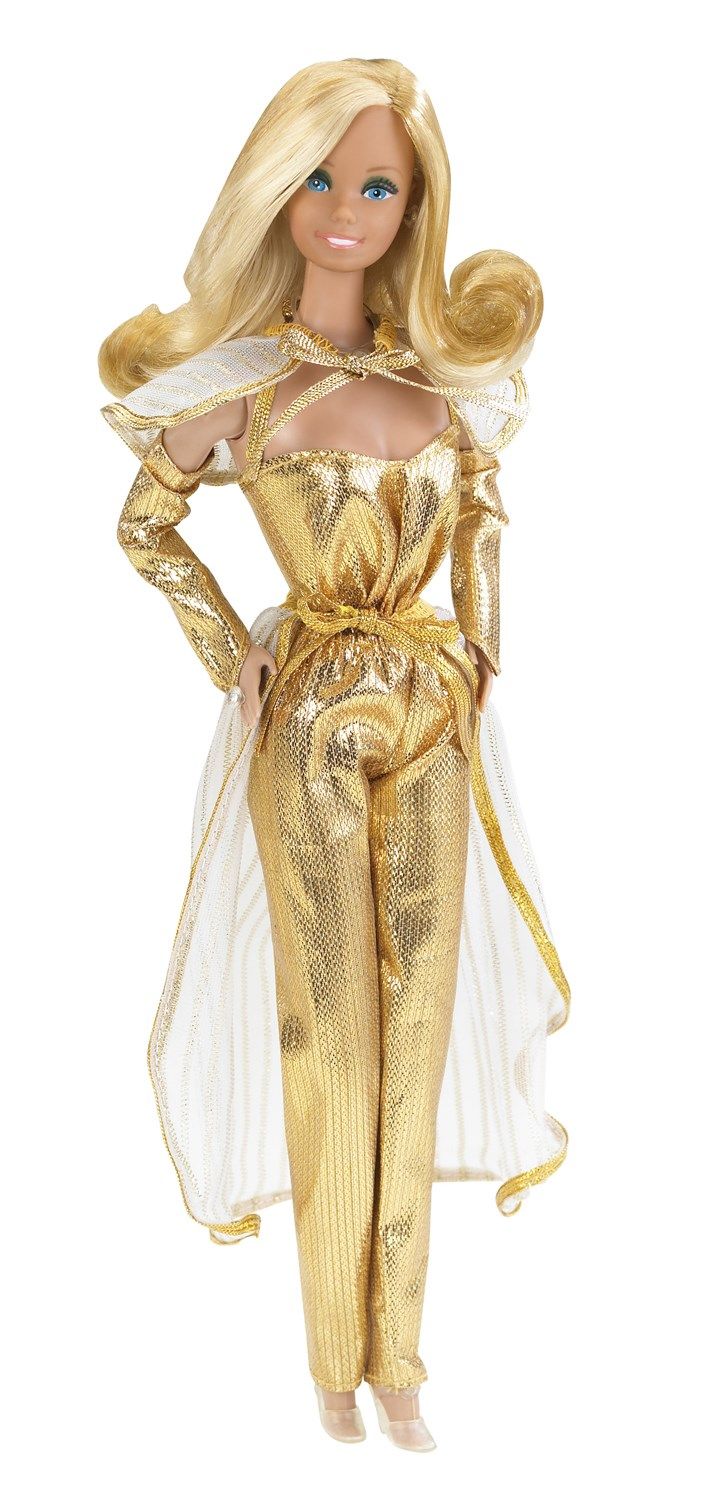 The glittery disco flair of the '70s was reflected in Superstar Barbie from 1977. The iconic doll featured bright blue eyeshadow, glossy pink lips, and fuller hair. Her chic pink dress and boa completed the super look. Superstar Christie wore a matching ensemble in yellow.