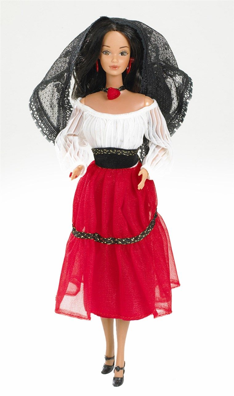 The decade began with the introduction of Mattel's first black and hispanic dolls to be named Barbie. Black Barbie wore a fierce red gown and an afro hairdo. Her box accurately stated "She's Black! She's Beautiful! She's Dynamite!" Hispanic Barbie wore a traditional red skirt with white blouse, and had long, shiny black hair. Her box declared "She's a Barbie doll just for you!", making girls with dark hair and dark eyes feel represented.